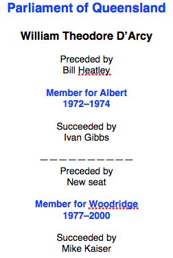 William Theodore "Bill" D'Arcy (born 31 July 1939) is a former Australian politician. He was the Labor member for Albert (1972–74) and Woodridge (1977–2000) in the Legislative Assembly of Queensland.